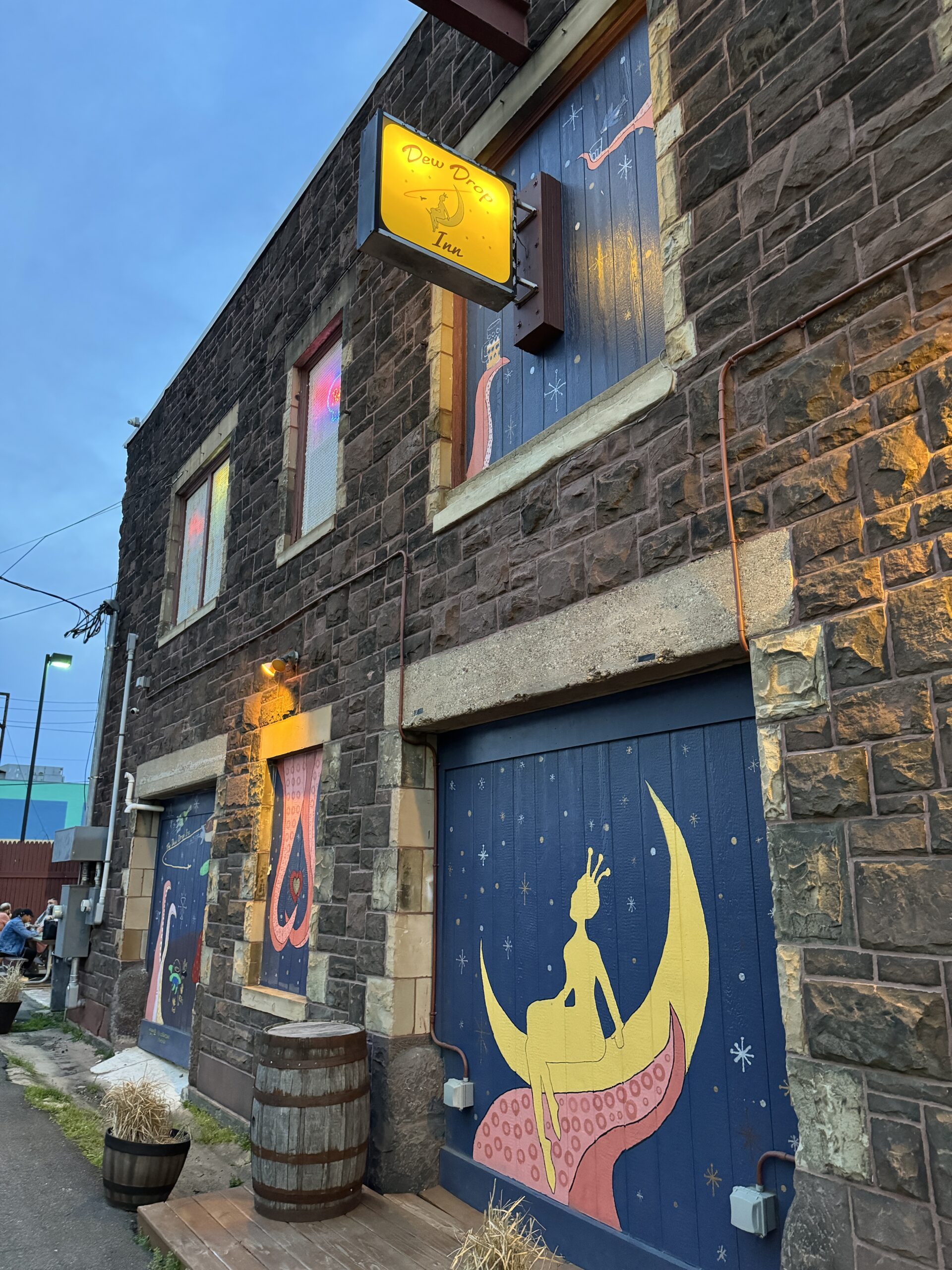 Dew Drop Inn cuts a commanding presence, looming as a standalone structure covered in stone, signage and painted murals over the boarded-up areas of former exterior windows. A sticker-covered door usually hangs open at one end of the bar, leading to a twisting staircase similarly covered in stockers, graffiti and other bits of dive bar wisdom. When weather allows, this outdoor area feels more like a divey beer garden, covered picnic tables circled around the base of Dew Drop Inn.