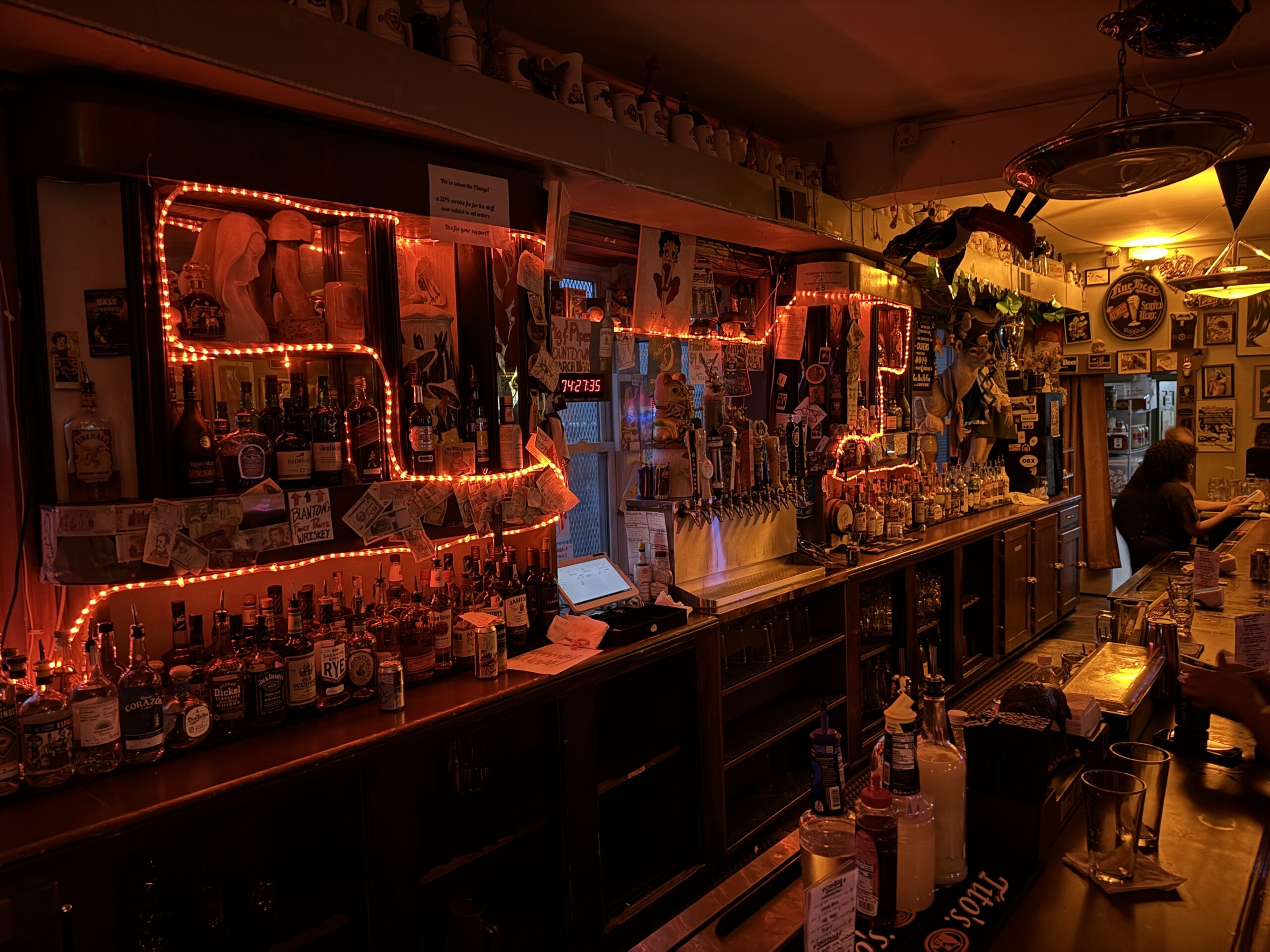 Despite only opening in 2015, a fair amount of pleasant dive bar clutter has amassed throughout the bar, particularly behind the bar counter itself where faded photos and string lights mix with bits of taxidermy and mannequins wearing Dew Drop Inn-themed apparel. Maybe most enticingly, changing the vibe at Dew Drop Inn is as simple as swapping rooms, the outdoor areas sometimes distinctly different from this often more densely populated main bar room.