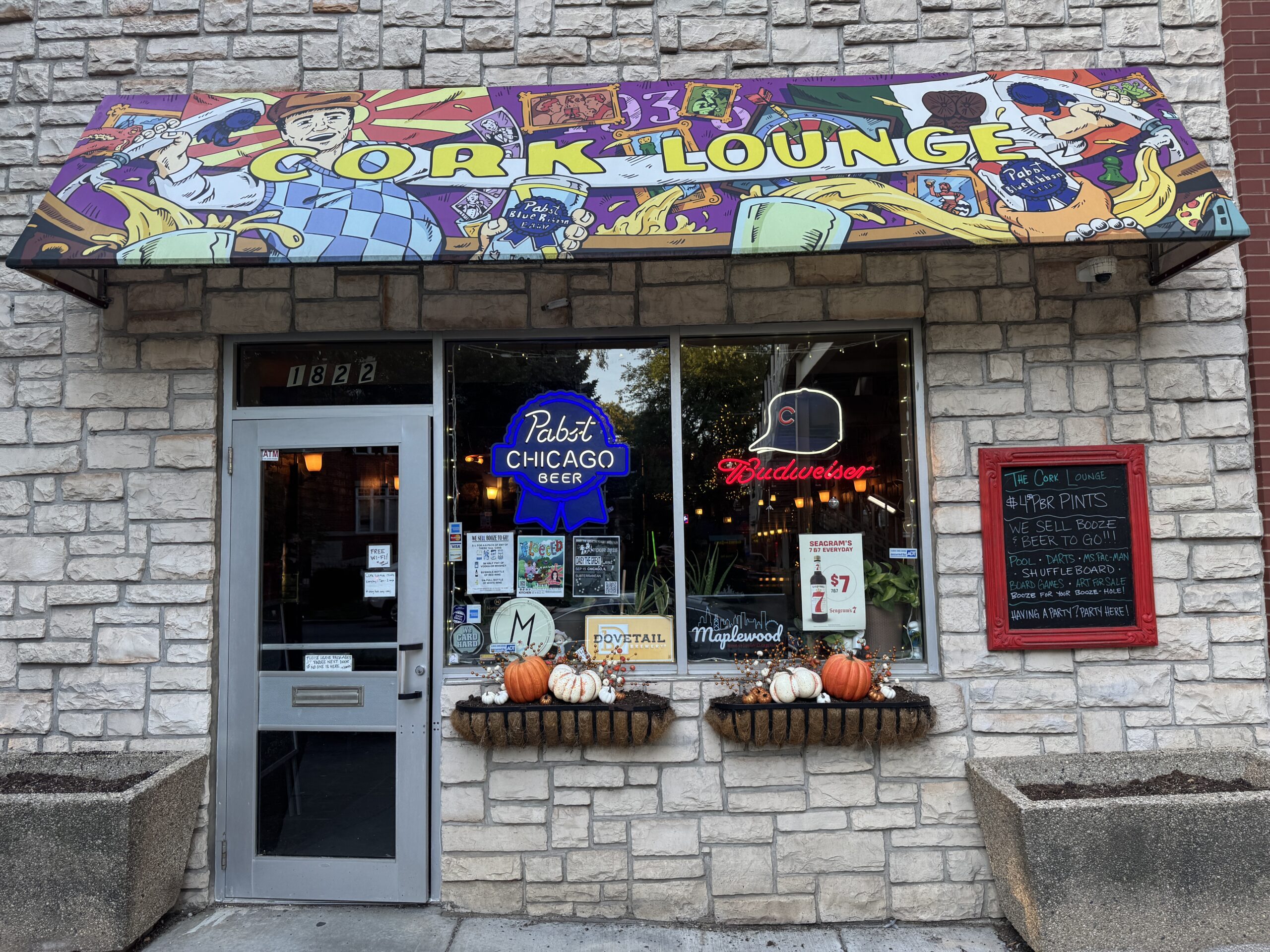 Though Cork Lounge opened in 2014, the building it inhabits was built in 1906 and opened as a bar of some kind post-Prohibition. The bar’s most obvious amenity is its physical attachment to the city’s Addison CTA Brown Line elevated train stop, offering the ability to minimize time spent outdoors between post-work commute and perfectly poured Guinness. The awning above the sign is decorated by local artists, the first incarnation of the awning the product of a competition won by artist Adam Richardson for the bar’s opening.