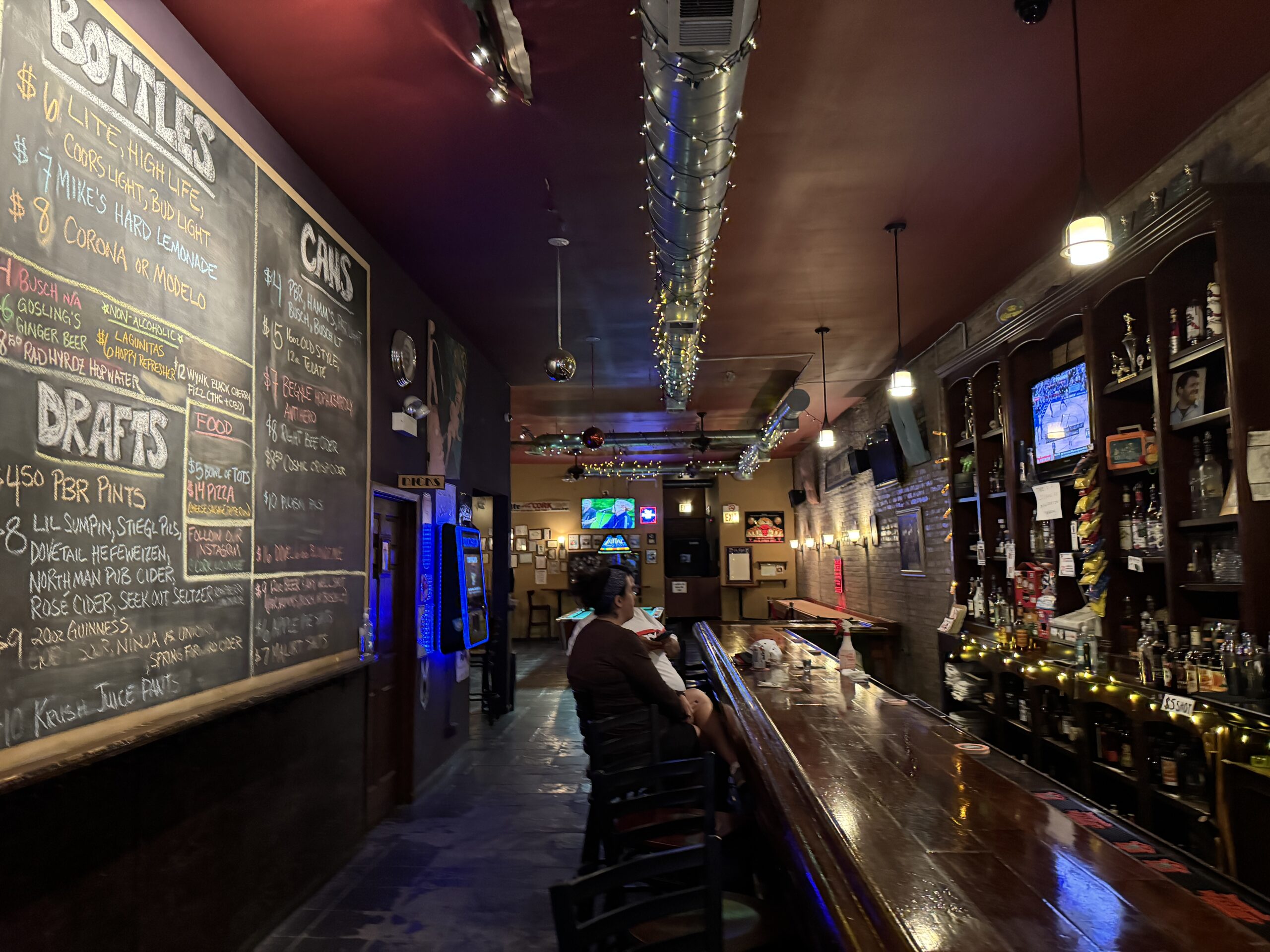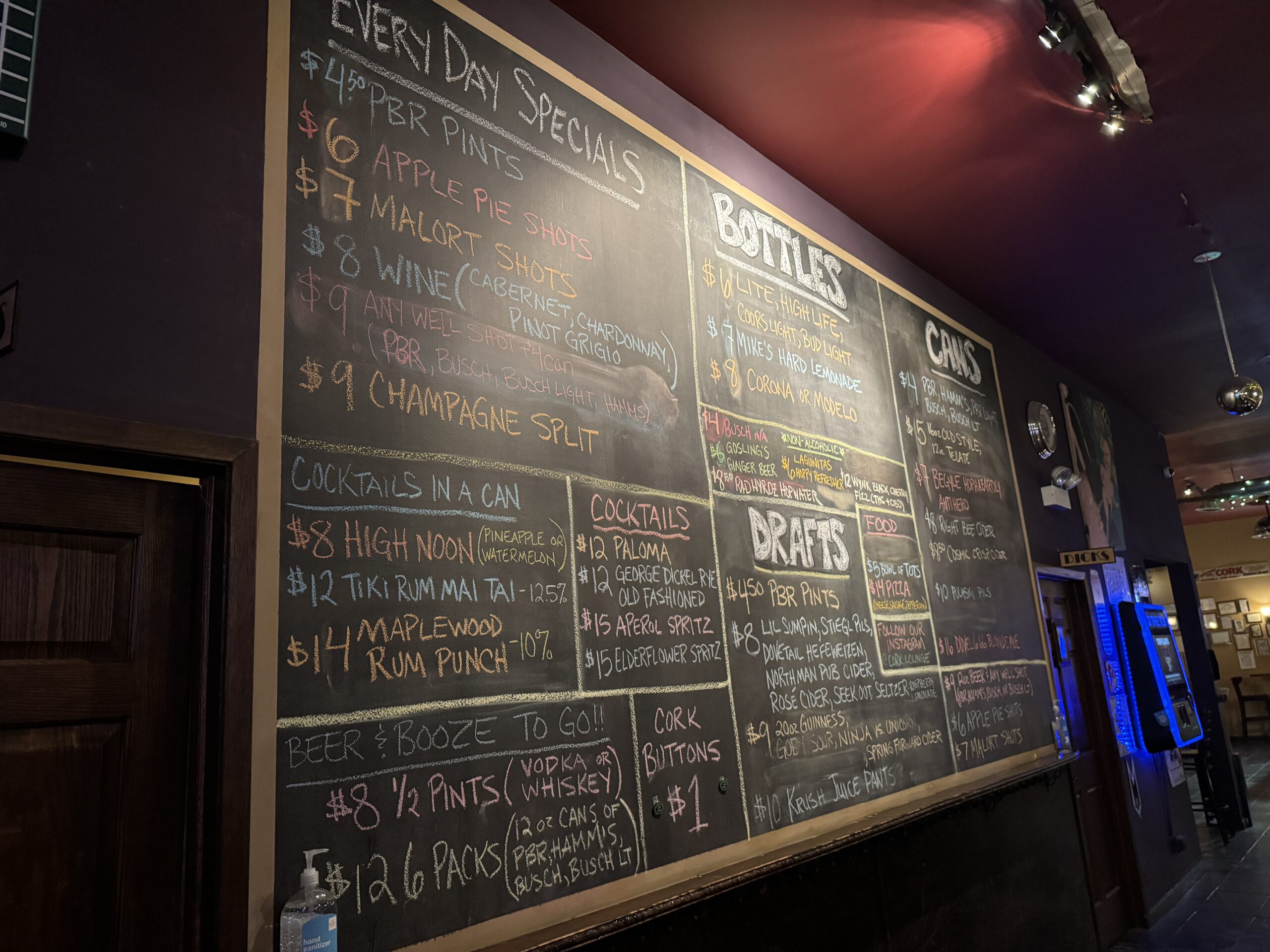 All of Cork Lounge’s drink offerings can be found inscribed on a massive chalkboard that sits opposite the bar, a sign that also includes a limited food menu that does shift from time to time but often includes a handful of simple pizzas and a “bowl of tots.” The space here is slender, Cork Lounge operating as a single, shotgun-style space with a more lounge-like seating area in front before transitioning into a long, mahogany bar that stretches what feels like far into the distance. A slightly more spacious pool and shuffleboard table area can be found at the rear of the bar.