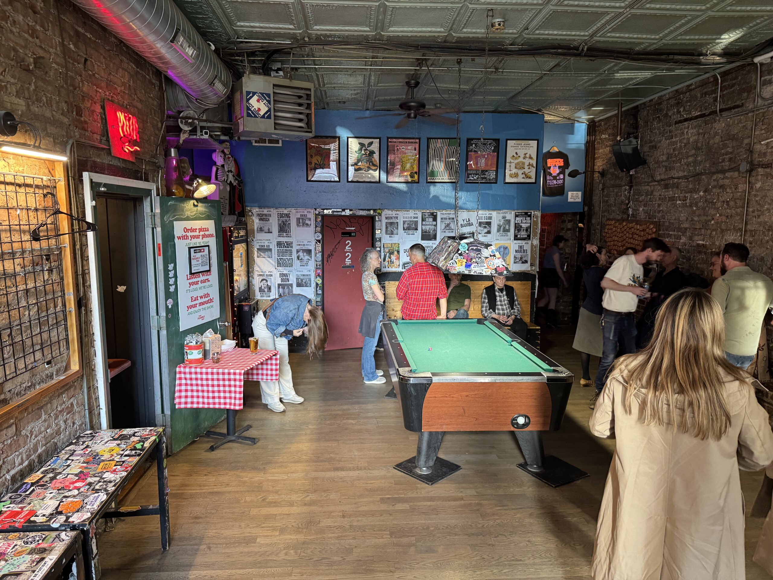 Amplifying the drinking and live music experience inside Empty Bottle is the structure itself, a corner plot distributed across two large rooms, one that feels a bit like a receiving area of sorts filled with a pool table and portal to next door Pizza Friendly Pizza and a second, longer room that houses the smaller-than-seems-possible stage in one corner and a long bar along the interior wall. As may be expected, music posters and band-related stickers cover almost every flat surface here, small callbacks to past shows and now-famous bands.