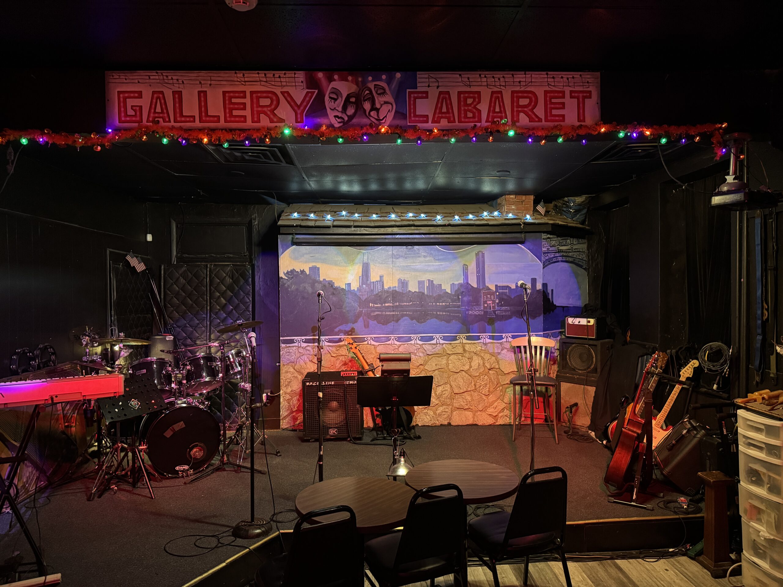 Naturally, the Gallery Cabaret space is structured completely in service of each night’s entertainment with the focal point of the building no doubt the elevated stage in the rear of the bar’s single room. Though the sign over the stage reading “Gallery Cabaret” has changed over the years, the backdrop has remained the same, perpetually a view of the Chicago city skyline.