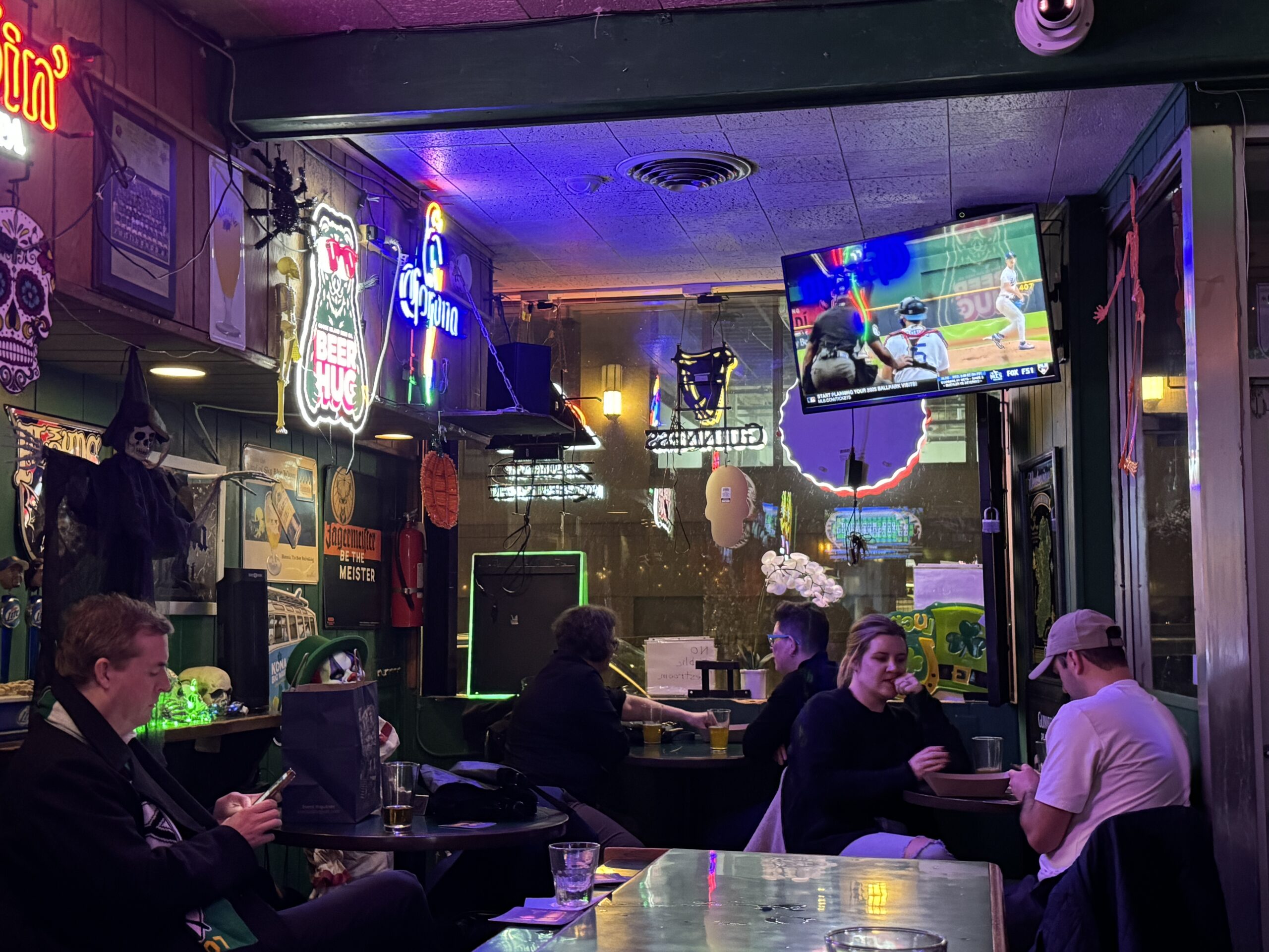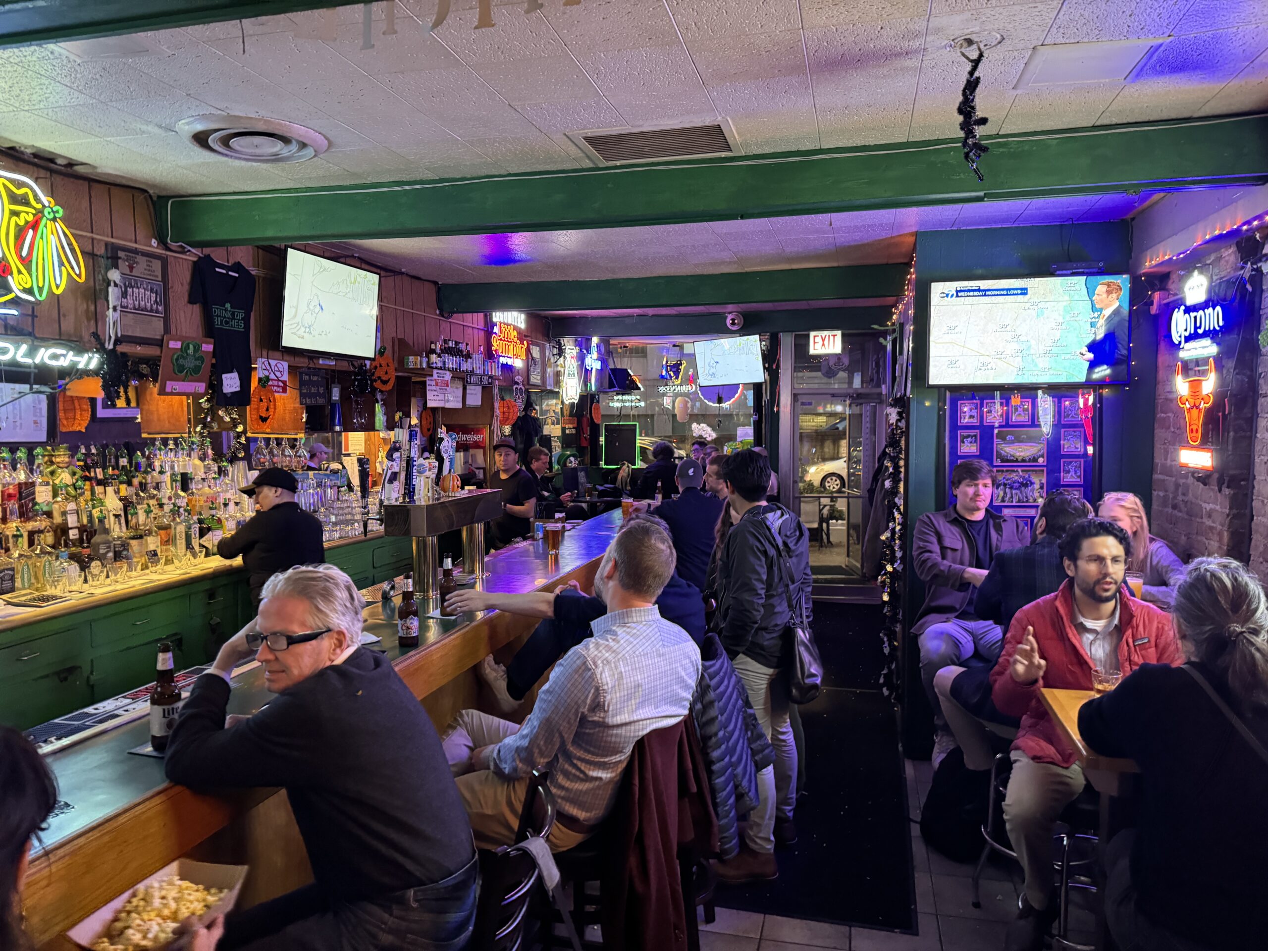 Unsurprisingly, the accent color inside is decidedly green, the counter, ceiling trim, kitchen area and all manner of decoration playing into the Irish theme of the River North dive bar. A bar counter (green of course) runs about halfway through the space, terminating in the kitchen area that cranks out bar staples like sandwiches, burgers and salads within what look to be tight confines. The kitchen typically stays open late but hours can vary based on the nature of the crowd.