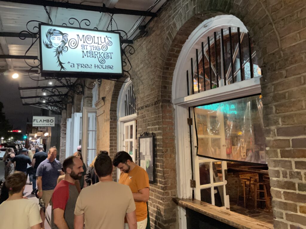 Along with dive bar brethren Aunt Tiki’s and Molly’s At The Market, The Abbey provides a crucially different experience for those willing to venture that few feet further. The Abbey in particular, under its stained glass-themed sign, seems to absorb all light no matter the hour of the day, creating a welcomed cave-like atmosphere away from the New Orleans sun. A couple of chairs can be found outside, but this is the kind of dive bar to retreat into, not spill out of necessarily.