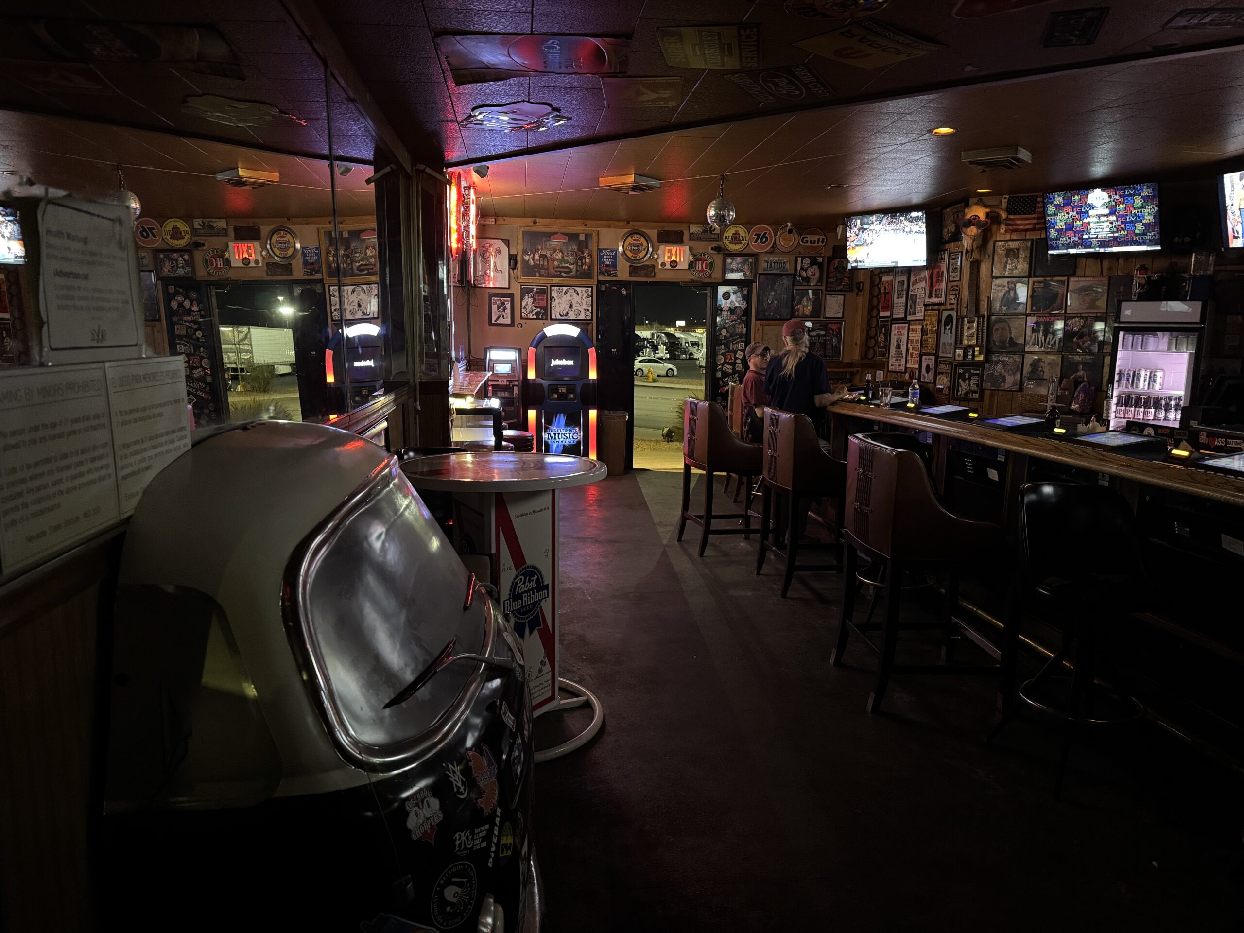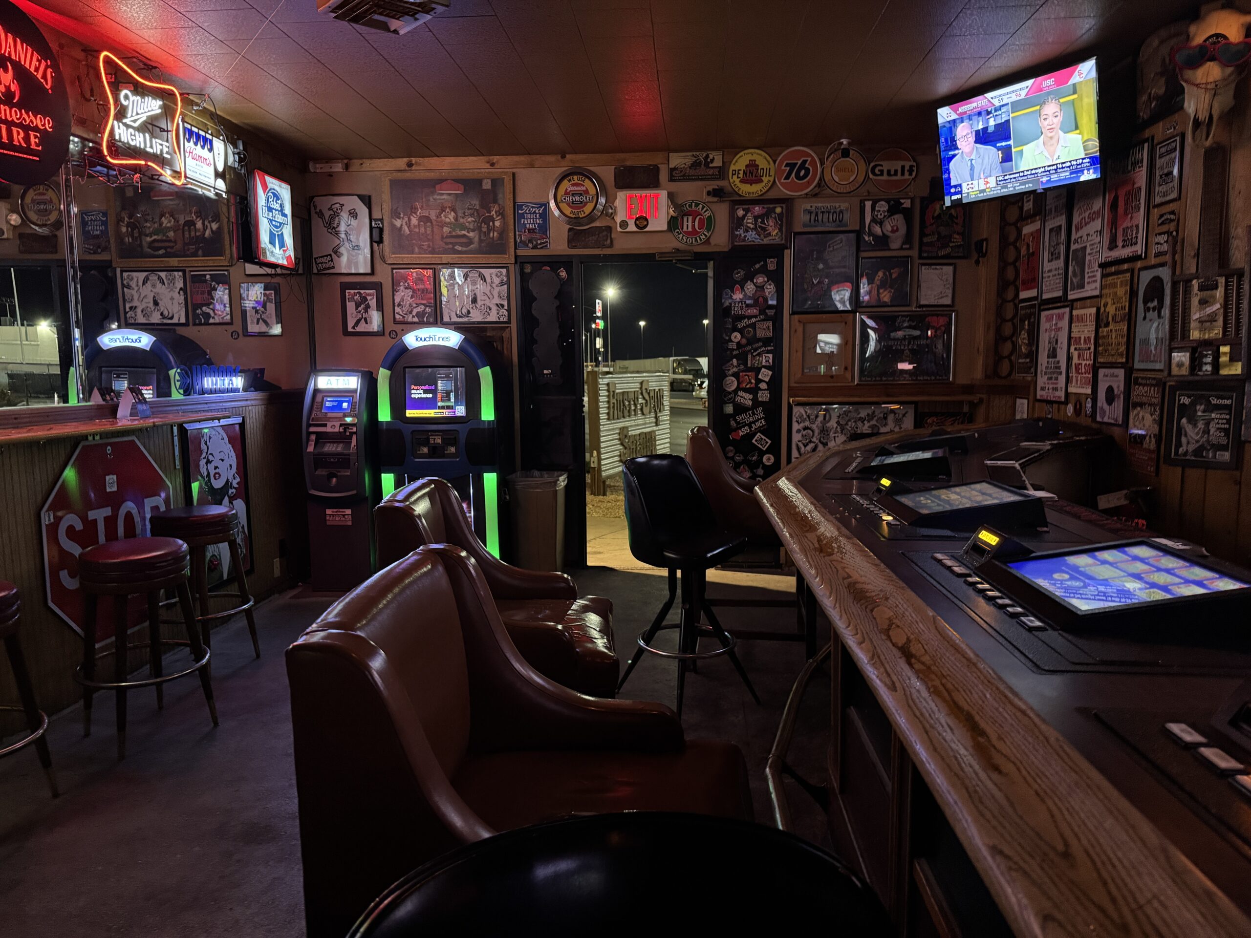 Perhaps the bar’s most thoroughly patronized amenity is its digital TouchTunes jukebox found inside teh front door. Depending on the tastes of the bartender on the duty, there is a high likelihood that the volume attached to the songs funneled through the machine is ratcheted well beyond even traditional dive bar levels. A pair of seemingly perpetually propped-open doors on either end of the bar thankfully let some of the sound dissipate, carried toward the desert.