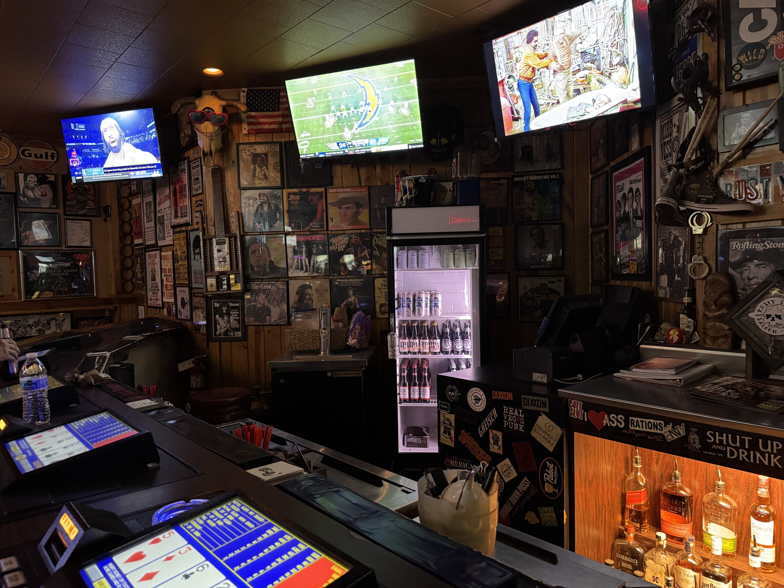 A brightly illuminated sign reading ‘Cocktails’ traces the bar’s roof just above the front door, ushering visitors into a space lined with country album covers, framed concert posters, old license plates and a collection of tin beer signs covering the bar’s ceiling. The confines here are cramped (did we mention that), underscored by the availability of no more than eight stools across the bar that dominates most of the bar’s available space. Video poker machines are set into the bar as per Las Vegas tradition, though the crowd here is just as likely to feed money into the jukebox as the machines.