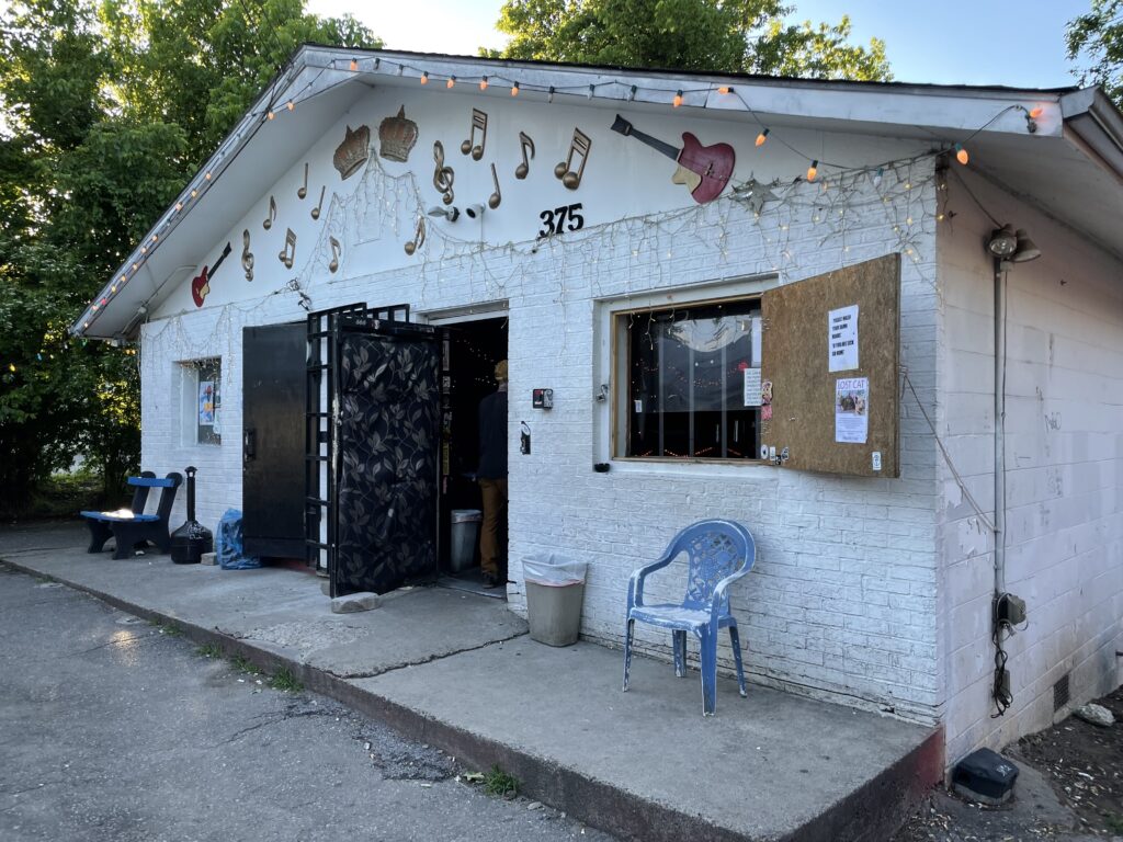 And while the food and non-food heritage of an Asheville dive bar named Burger Bar is interesting, the hero is really the building itself. Burger Bar is positioned across the river from Asheville’s dense downtown area as the lone building at a fork in the road. Its location makes for a pretty glorious first impression with the dive bar first comes into view, a glimpse of a ramshackle faded blue hut in the middle of the road like the dive bar siren song it represents. In total, the footprint feels like a rural shed crossed with a corrugated metal lean-to, some rope lights seemingly holding the contraption together.