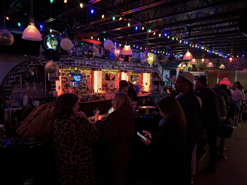 Inside, all manner of what feel like haphazardly sourced chairs, tables and decorated create a dense and varied seating environment, all lit with Christmas lights. There are beach chairs, foot stools, wooden tables and some kind of sign, painting or decoration on seemingly every inch of the inside space. Commonplace Bud Light neon signs coexist with hand carved mermaids and what looks to be a sign from an old-timey steamship. The bar feels like some kind of Highlights-style hidden picture search that someone drunkenly concocted after a few walk-in cooler beers.