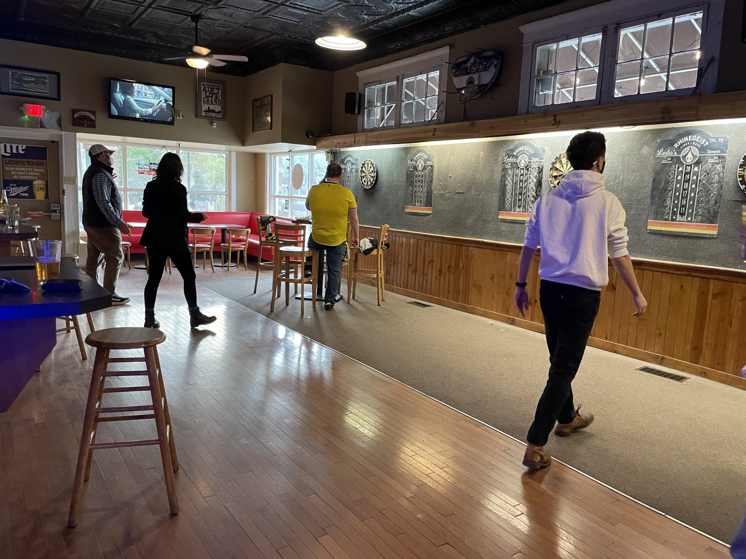 And that secondary space houses what is probably the Ledo’s Tavern signature feature, a row of dart boards that serves as the bar’s center of gravity most nights. Steel-tip boards line nearly the full length of the long room, ample drinking ledges and low tables provided to support the beers of those playing. Because of the multiple available boards, serious players with their own darts are sometimes attracted to Ledo’s Tavern, but for us normal folks, loaner darts are available at the bar.