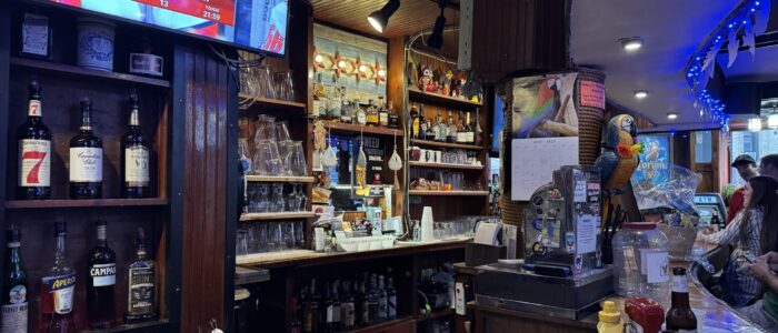 Outside, the marquee attraction is of course the faded, plastic shell sign illuminated with the image of, you guessed it, a parrot. The bar exterior feels like more an extension of the apartment building above rather than something distinct, making the tiny sign on the corner of the bar crucial to spotting its location on a first visit. The Parrots Bar & Grill footprint is deceptively large, spanning two slightly subterranean rooms, one devoted to the main bar area and another to the bar’s pool table.